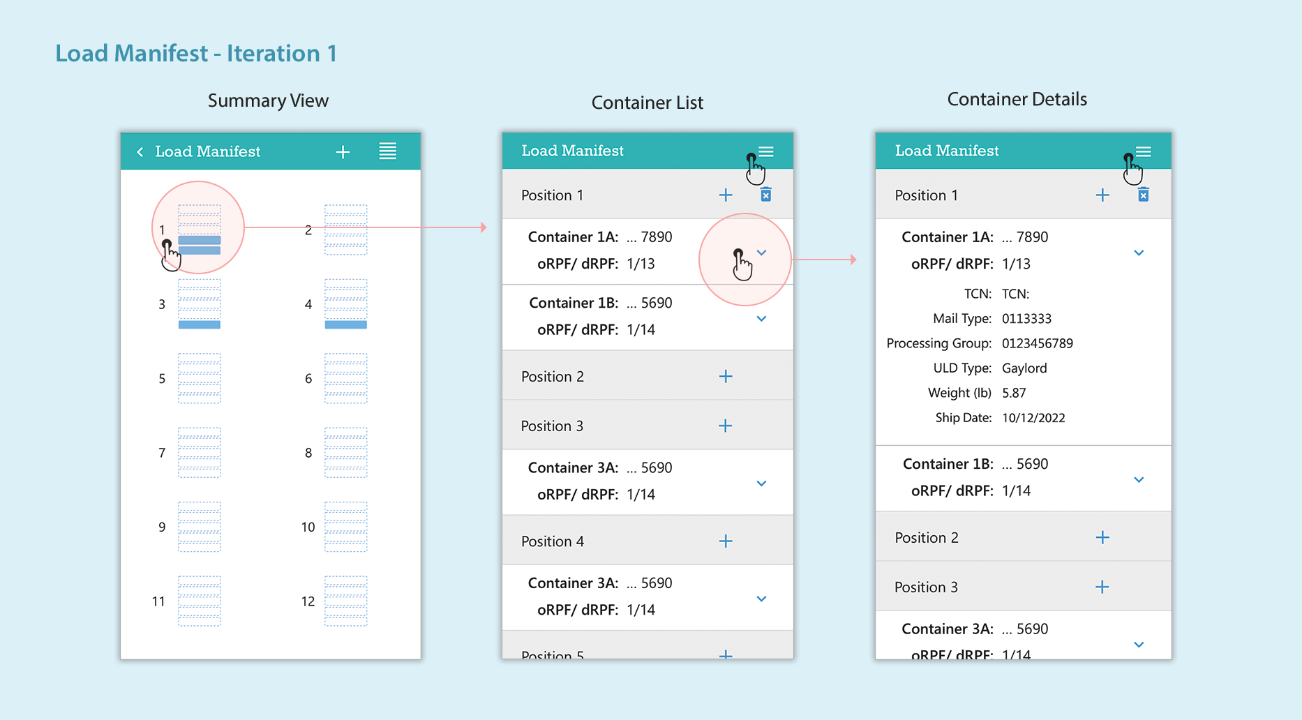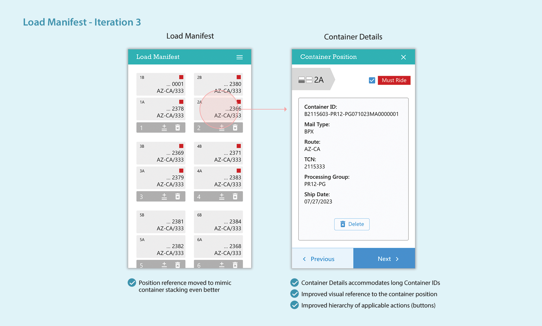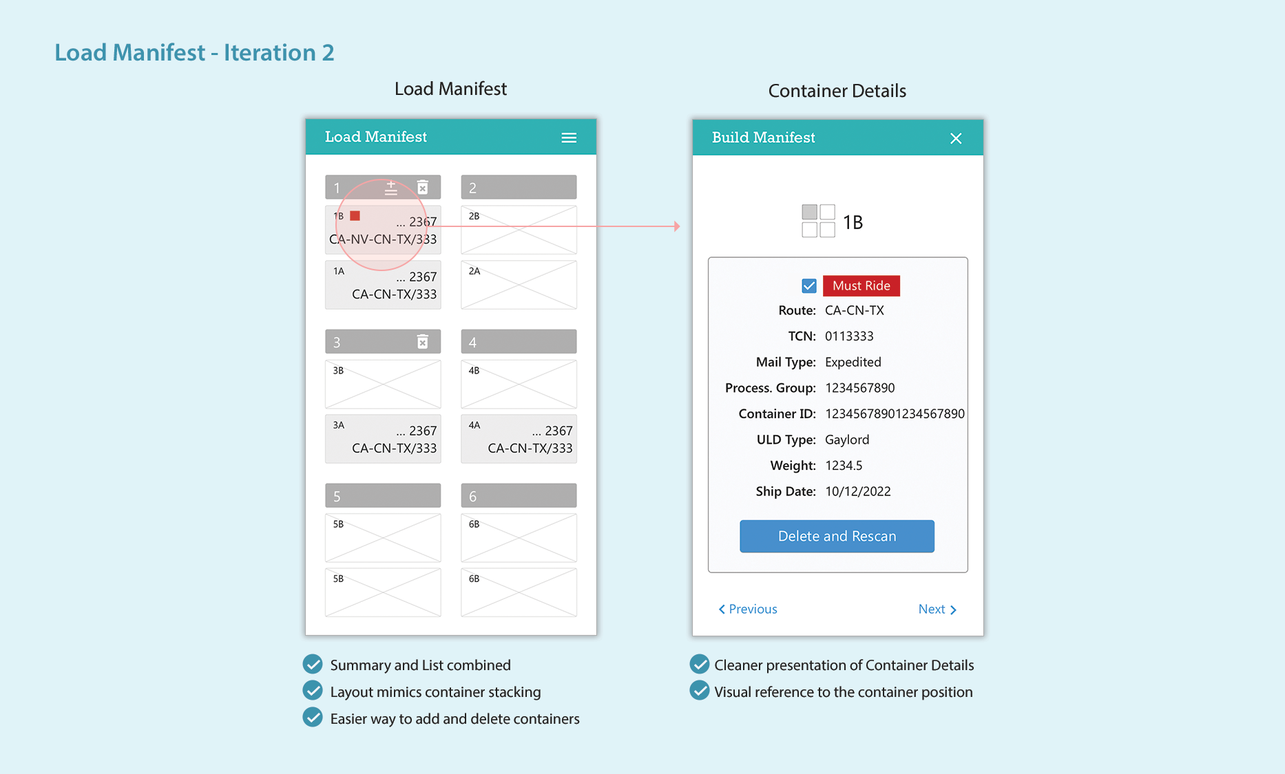 I explored multiple ideas for the Load Manifest to achieve simplicity, ease of use, and minimal user input. The illustrations below show a progression of the design of the online Load Manifest and Container Details screens.