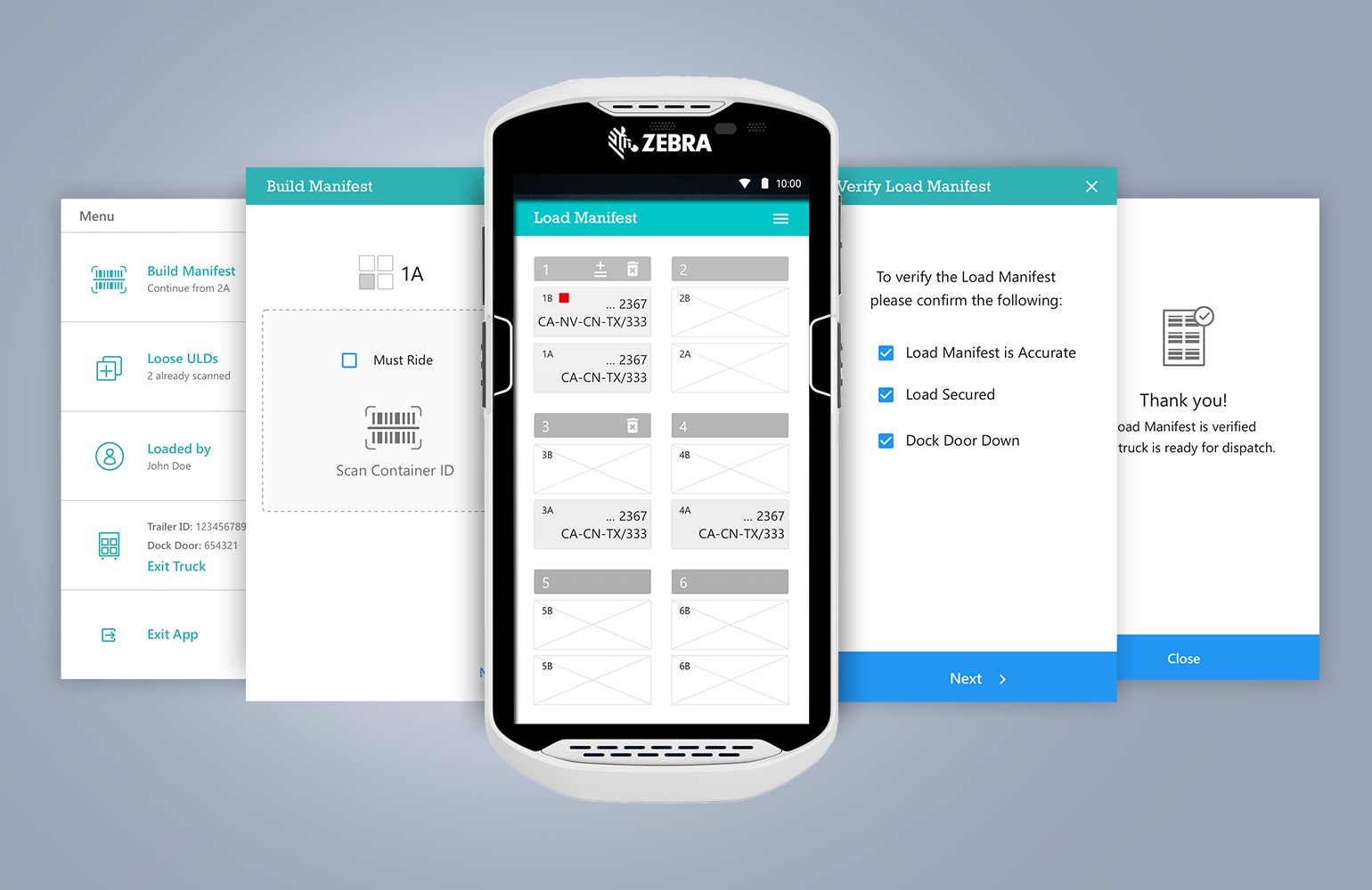 The Load Manifest acts as a central and pivotal point. A hamburger menu takes the user to the rest of the app.