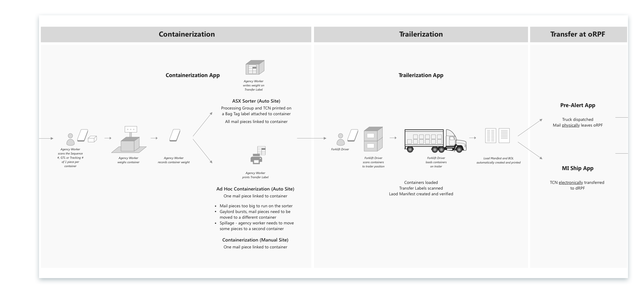 For the team to think holistically and understand the role of the trailerization process and app, I created a high-level visualization of processing and transferring mail between UPS facilities (click image to enlarge).