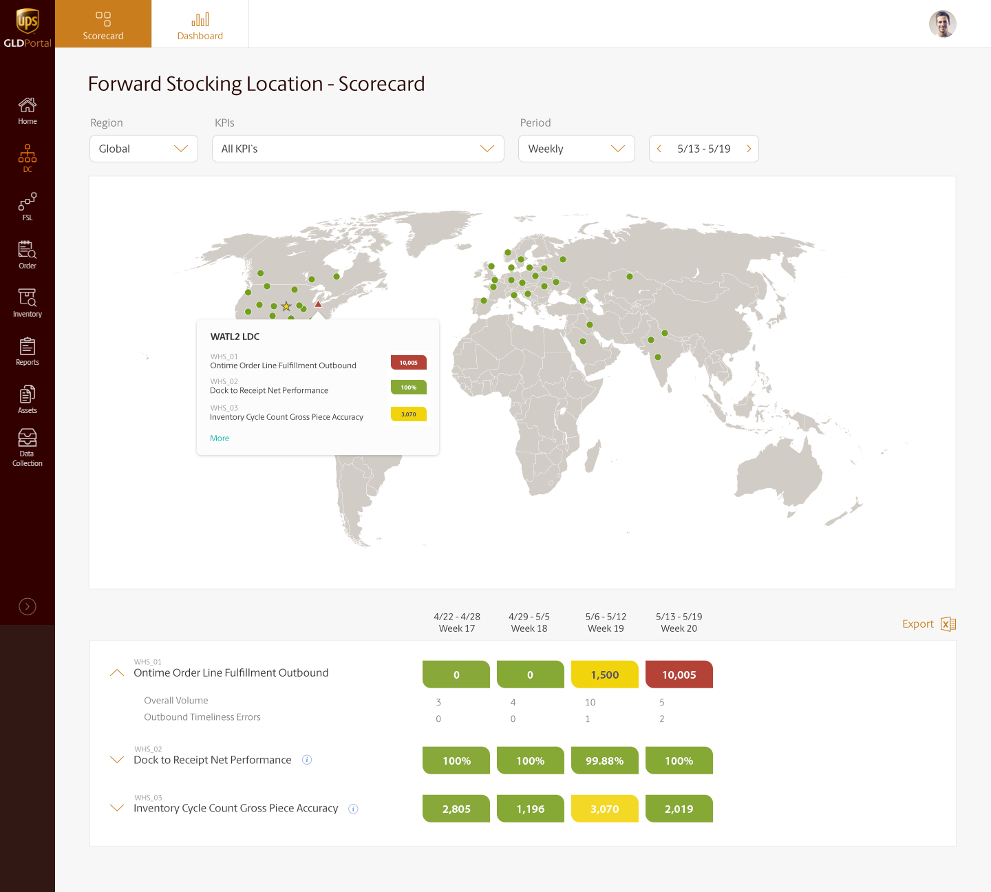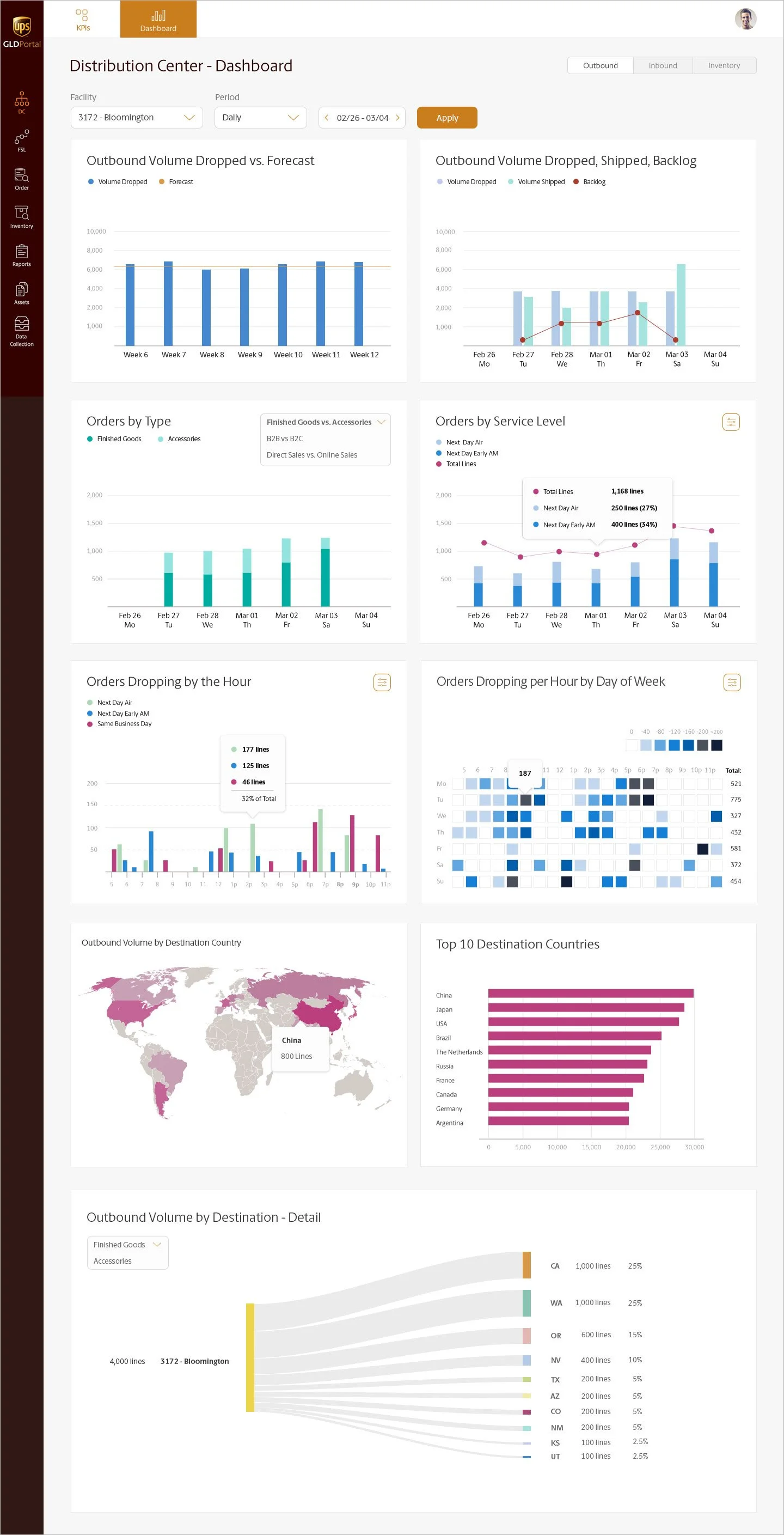 Two years later, we had a working Global Logistics and Distribution Portal showing data for the inbound, inventory, and outbound warehouse operations for four warehouse facility types. The Portal had a KPI reporting area (online Scorecard), a Dashboard, a Reports area with a data collection tool, and an online space for sharing additional data. The project was then handed over to a third party for further development. The current UPS Supply Chain Symphony Portal is heavily based on the initial research and prototypes that my team and I worked on.
