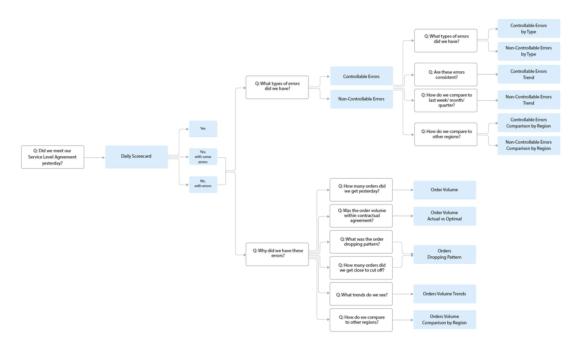 The interviews helped map out the thought process for error analysis as a series of questions. Then, we identified data that helped answer the questions. This became the framework for our storytelling with data.