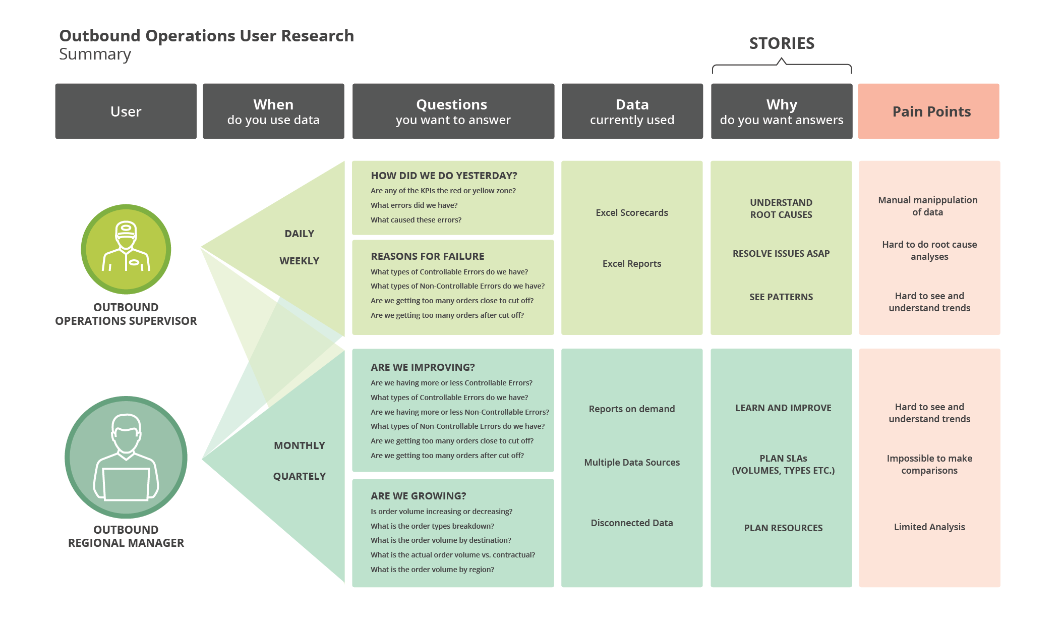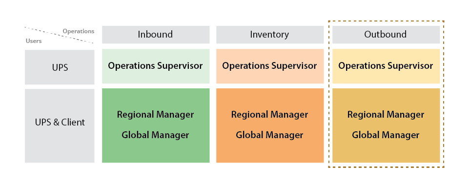 The interviews helped us identify 6 user types. The primary differentiator was the type of data and analysis a particular user group needed. For the purpose of this case study I will focus only on the Outbound users - Operations Supervisor, and Regional and Global Managers.
