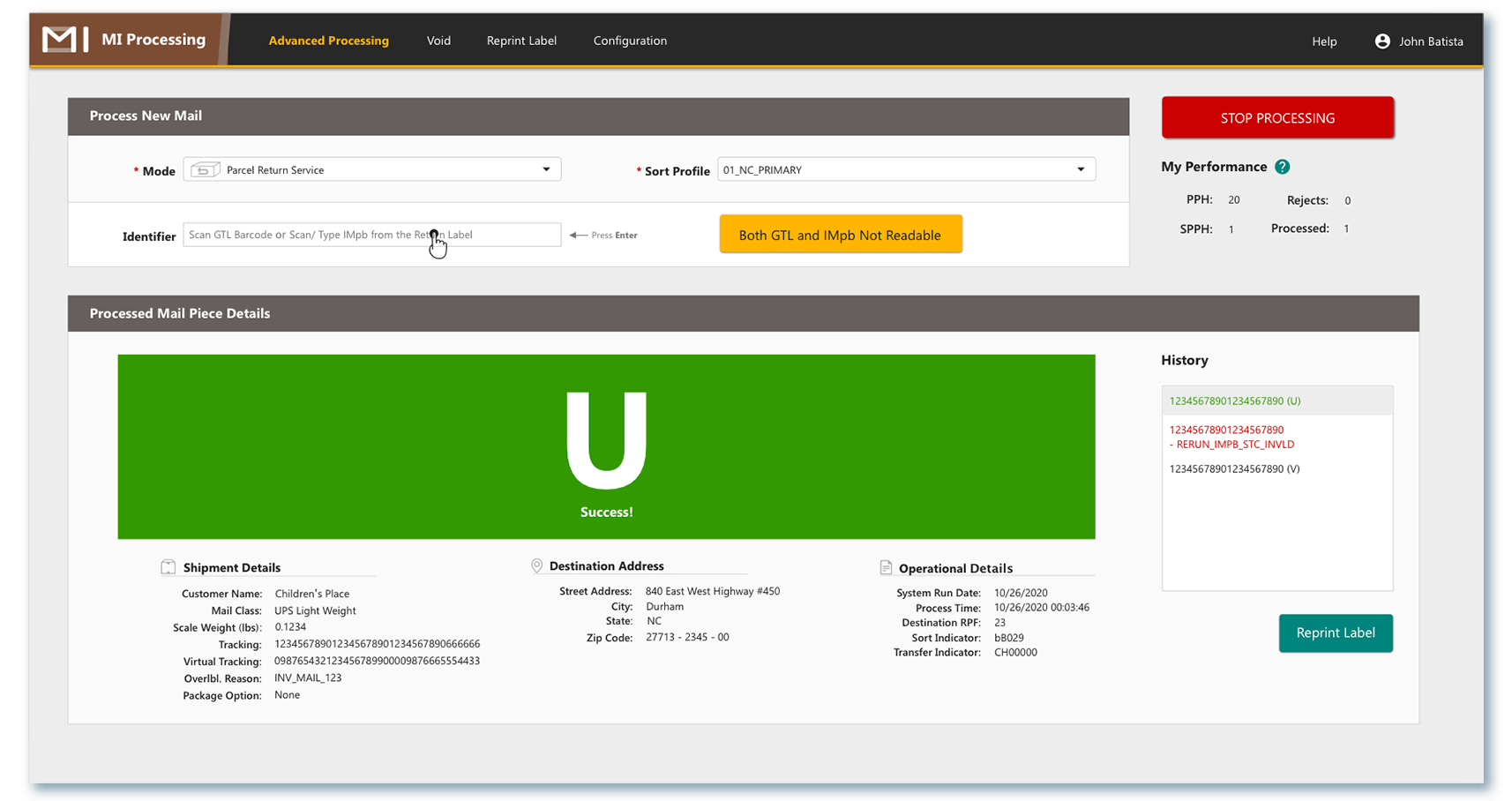 App for processing mail at an origin facility. Mail is scanned, weighed and redirected to specific location based on the destination address. Main Innovations label is printed and is used for mail sorting.