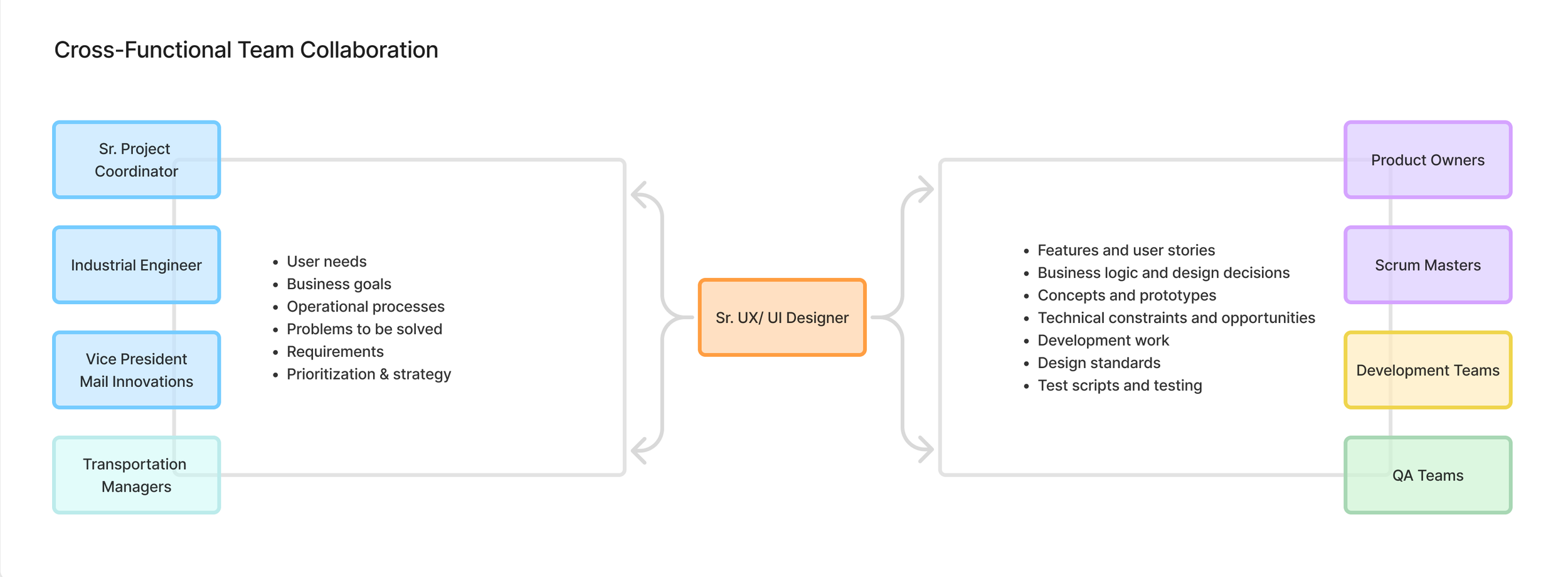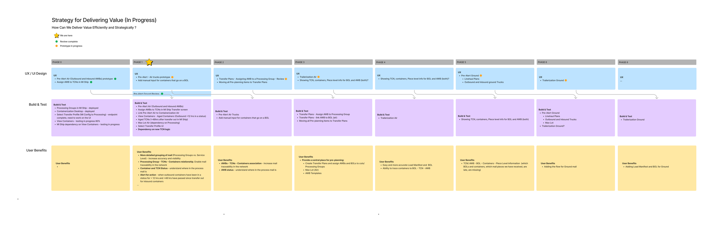 I led discussions and visualized how the new applications would work together to improve information connectivity and increase user visibility into the mail in the UPS network. We continuously iterated on the vision and kept this document as our North Star. The diagram helped with planning, prioritization, and decision-making. (Click image to enlarge)