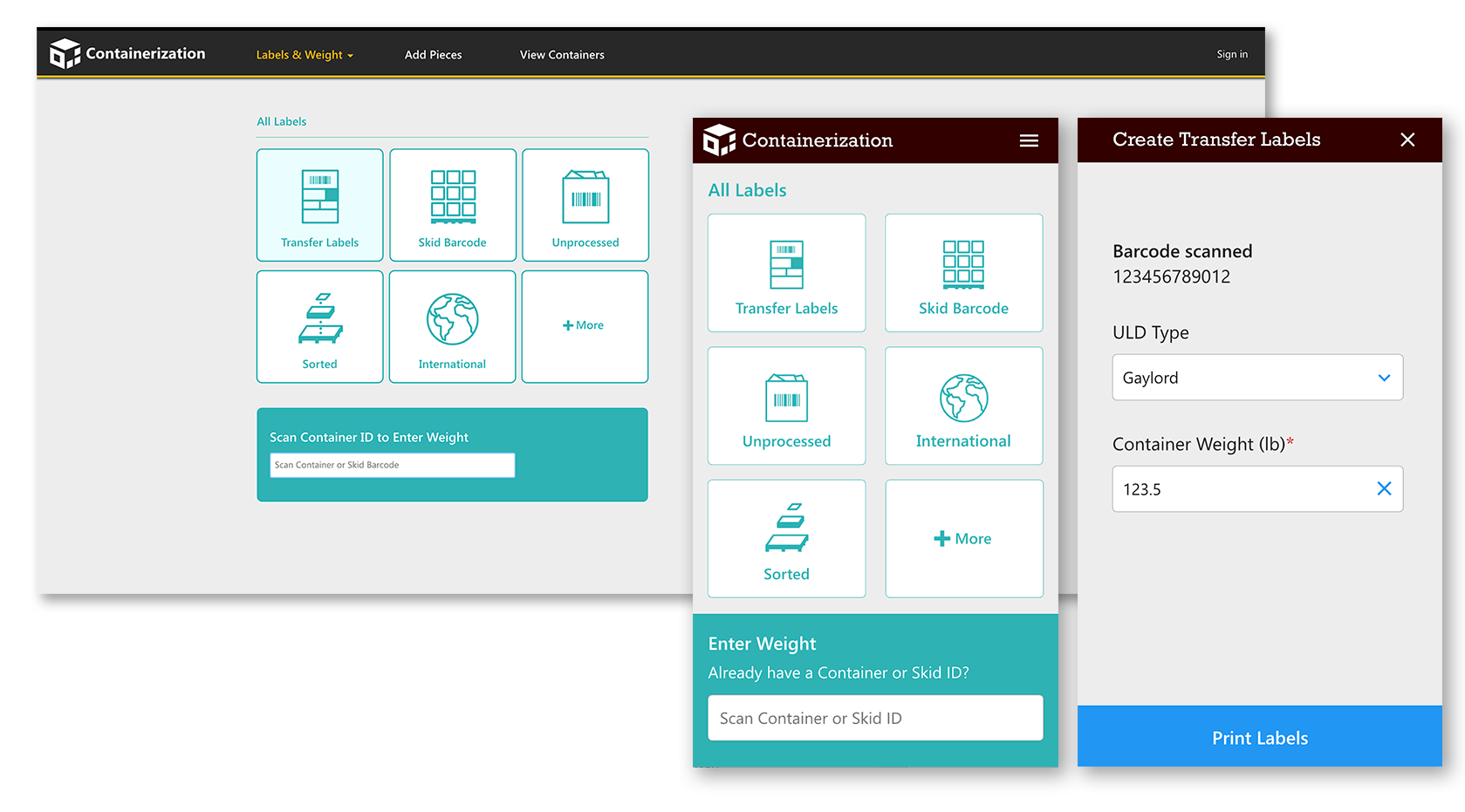 Responsive desktop and mobile app for creating container IDs, container labels and record container type and weight.