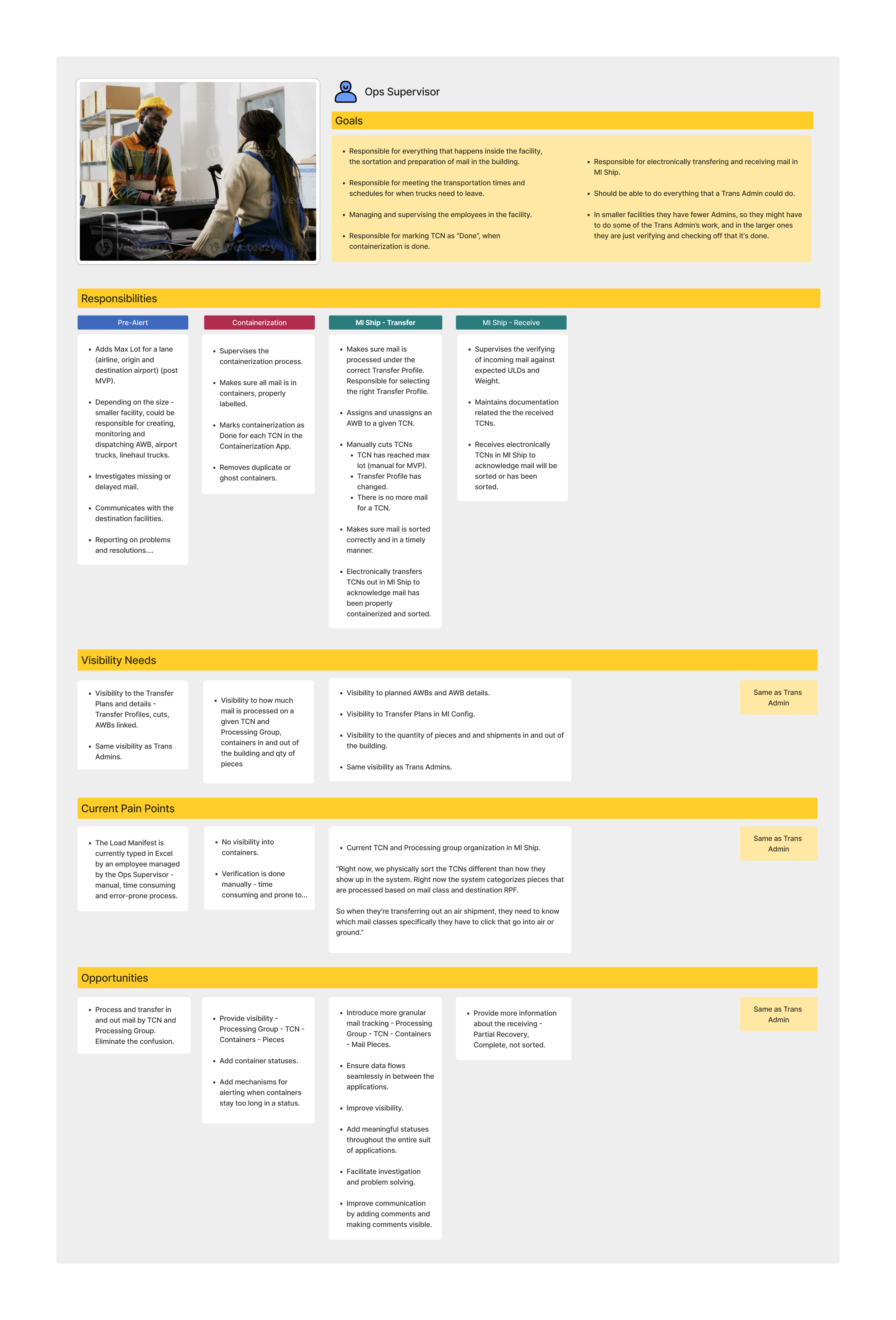 Three of the five applications in the suite were to be used by three user types. I documented the need for each user type to use the three applications. I dedicated a separate section to the visibility needs of each user type, as increasing the visibility into the mail in the UPS network was consistently stated as one of the primary goals of the new suite. (click to enlarge)