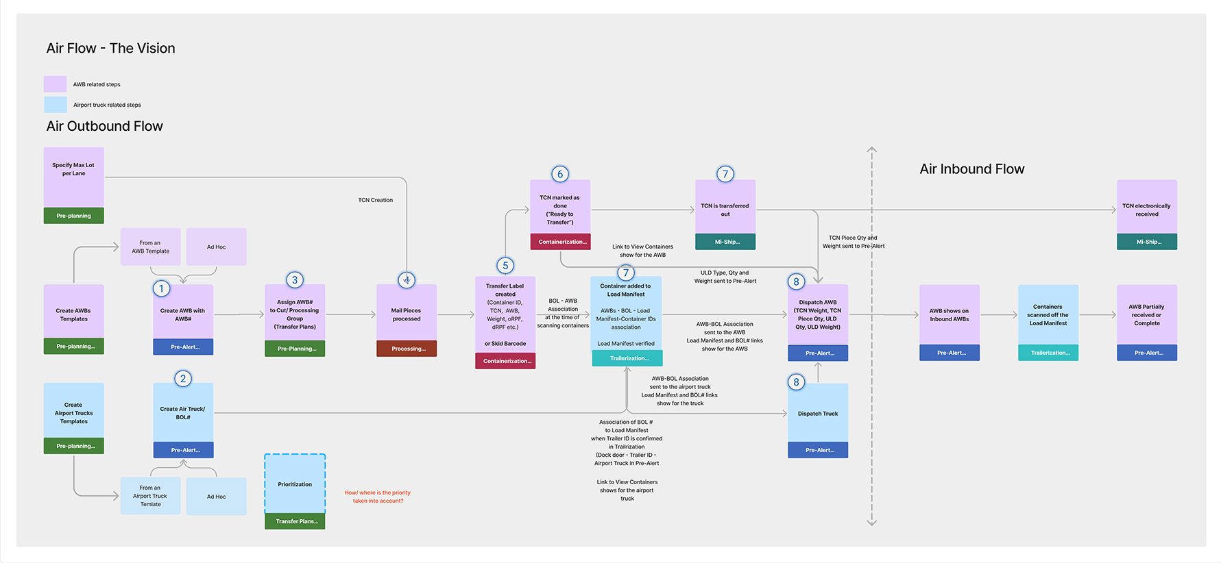 I documented and visualized the future vision for the applications, information flow, and dependencies of the modernized processing and moving air mail in the UPS network. It helped the team understand the processes, prioritize, and plan work. (click to enlarge)