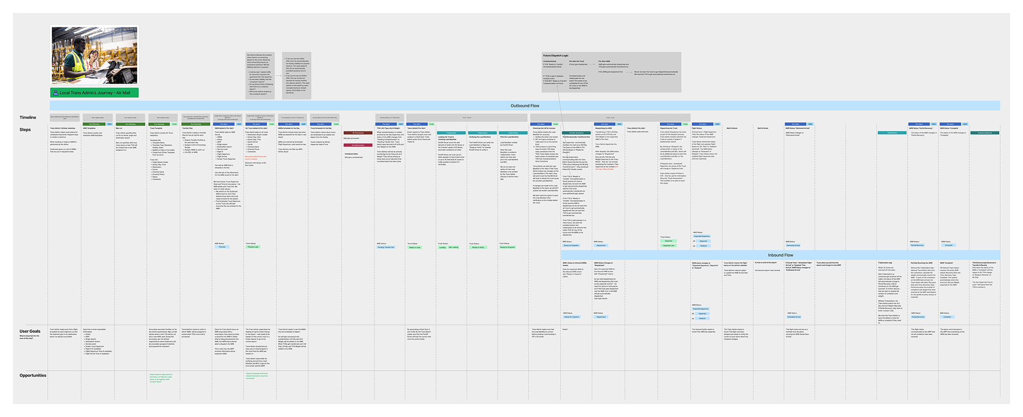 The user journeys described a user’s interaction with the MI Suite applications throughout the movement of mail in the UPS network. MI Suite user journeys were created for the three personas. They were continuously revised as we learned about the business processes and defined the information flows. The user journeys informed the design of the application prototypes. (click to enlarge)